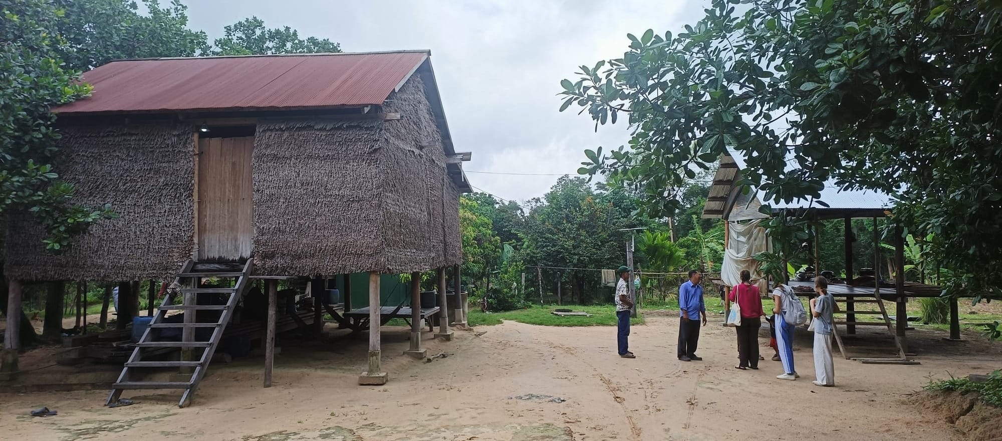 We slowed down as we entered, the atmosphere calm and familiar. Chickens wandered freely, children smiled curiously, waving and laughing, and the air carried the faint smell of wood smoke and earth. Meas, one of the teachers, walked toward us with a wide smile, as if it was the most normal thing in the world for us to arrive by dirt bike through the jungle.
