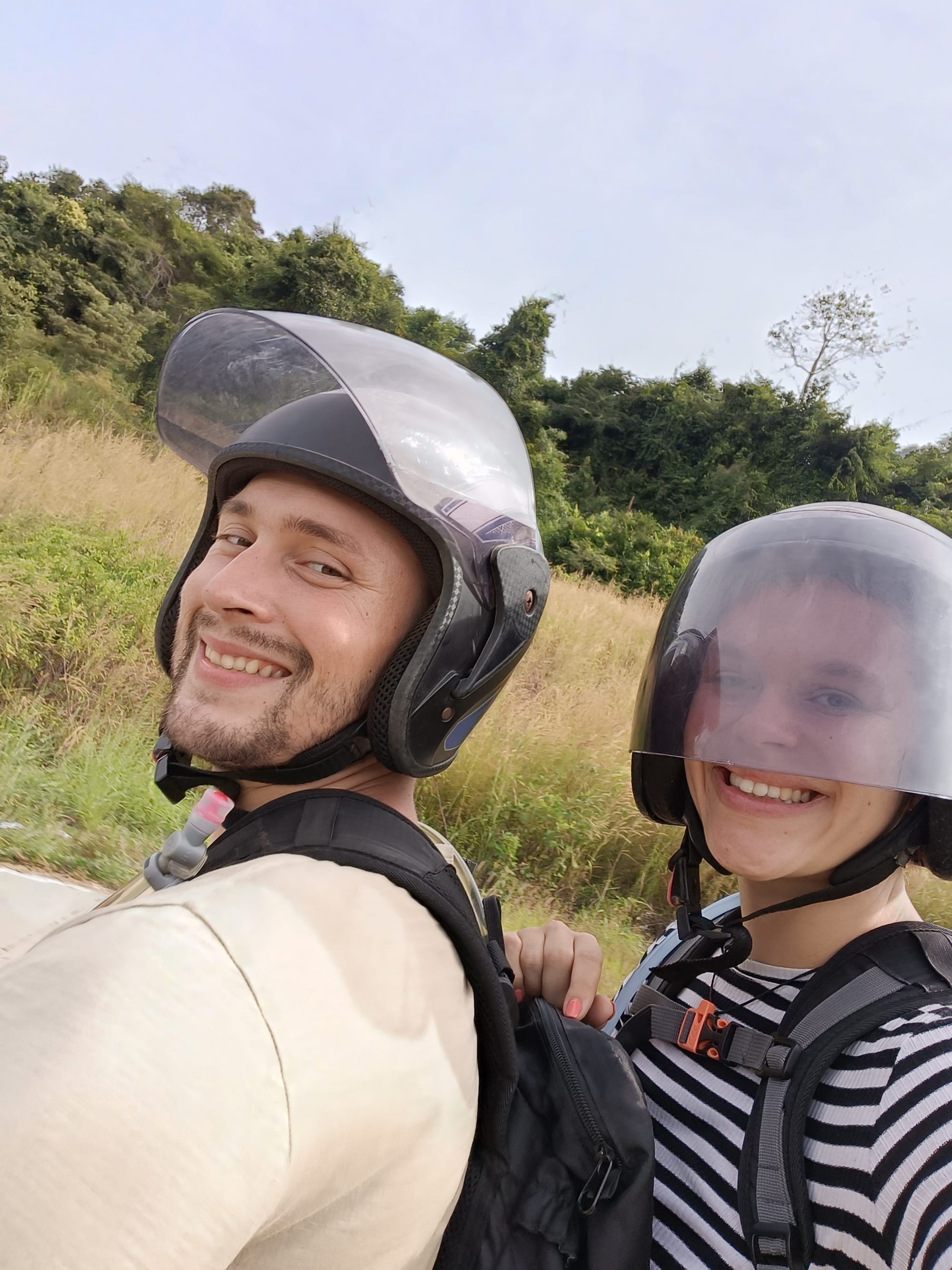 An enormous black snake slid across the road in front of us, smooth and quick, disappearing into the bushes as it had always belonged there. My grip tightened instantly. We both went quiet for a moment, hearts racing, before nervously laughing it off.