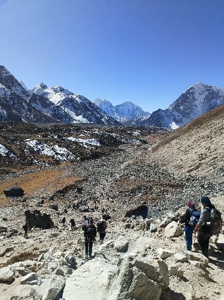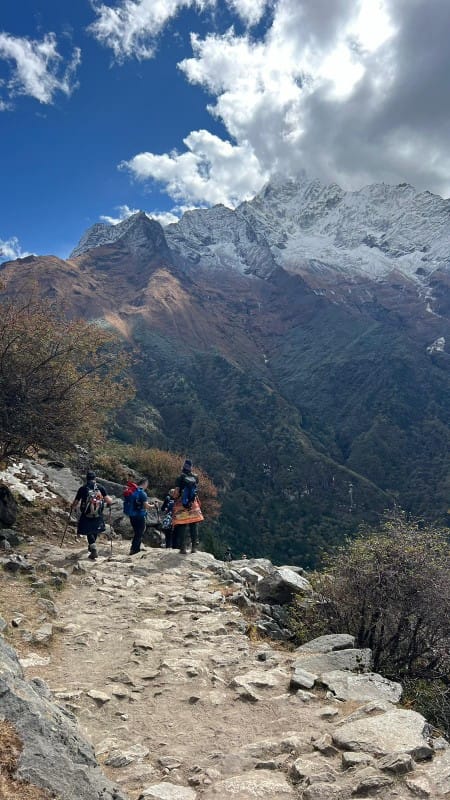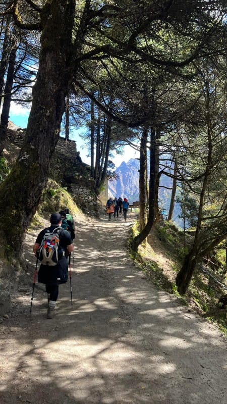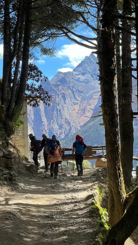 We started the hike at 6:30, stepping out into the freezing Himalayan morning. The air was sharp enough to sting the skin, biting into your fingers even through gloves. My left knee throbbed with every movement, fiery, dull, and relentless, making each step feel like a small negotiation with my own body. But we moved forward anyway. Slow, steady, determined. Today’s hike would stretch over 21 kilometers, all the way back to Namché Bazaar at 3440 meters.