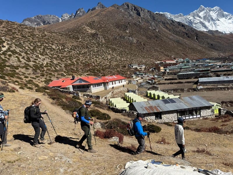 At 17h, after hours of winding down the mountain, the trail made one final bend, and there it was, Namché. Spread across the mountainside, colorful roofs stacked like steps against the slope. It felt like seeing civilization again after weeks in the wilderness. Relief washed over all of us.